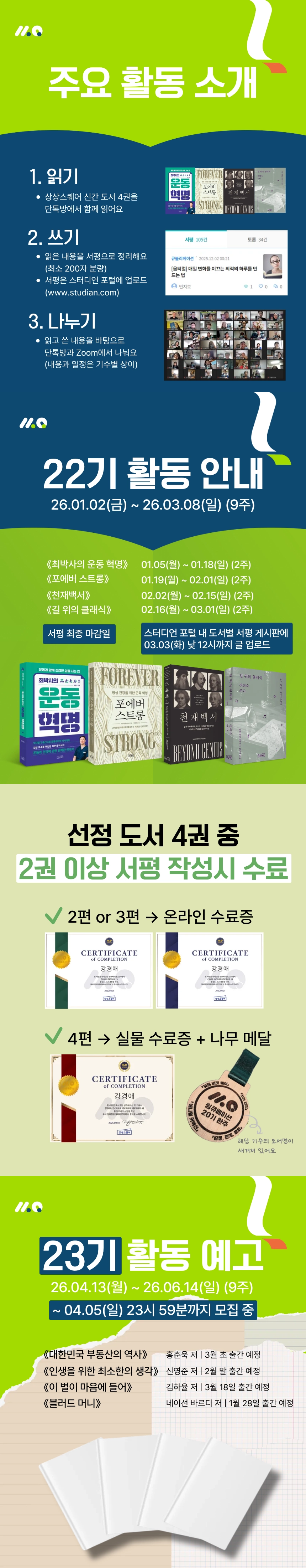 은 상상스퀘어에서 출간·선정하는 도서 4권을, 2개월 동안 카카오톡 단톡방에서 함께 읽고 쓰고 나누는 무료 독서 모임입니다. 본 화면은